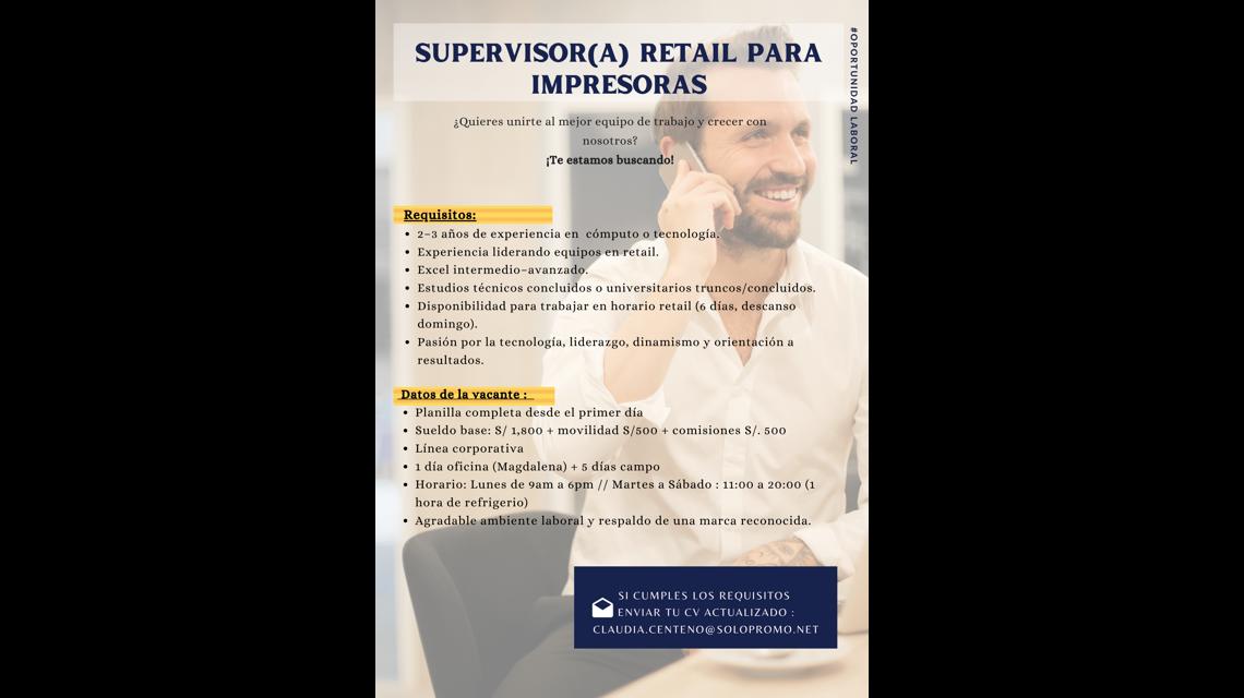 Supervisor(a)de Venta/ Impresoras / Experiencia Canal Retail - Ingreso Mayo // Planilla completa// Descanso los días domingos
